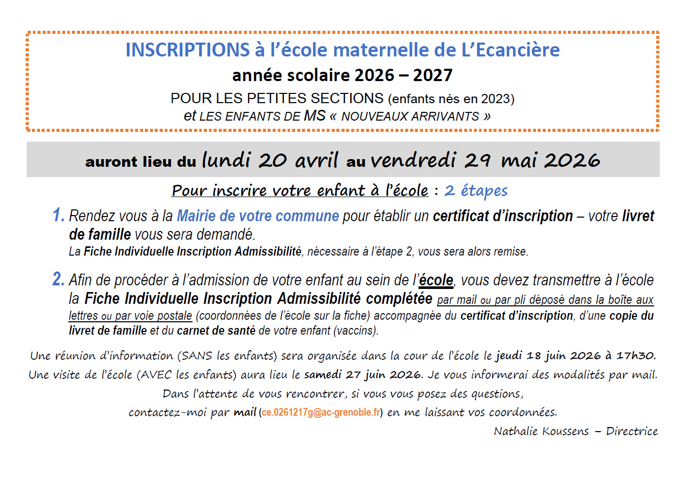Si besoin, vous pouvez contacter la Directrice de l’école Madame KOUSSENS Nathalie, par mail : ce.0261217g@ac-grenoble.fr.